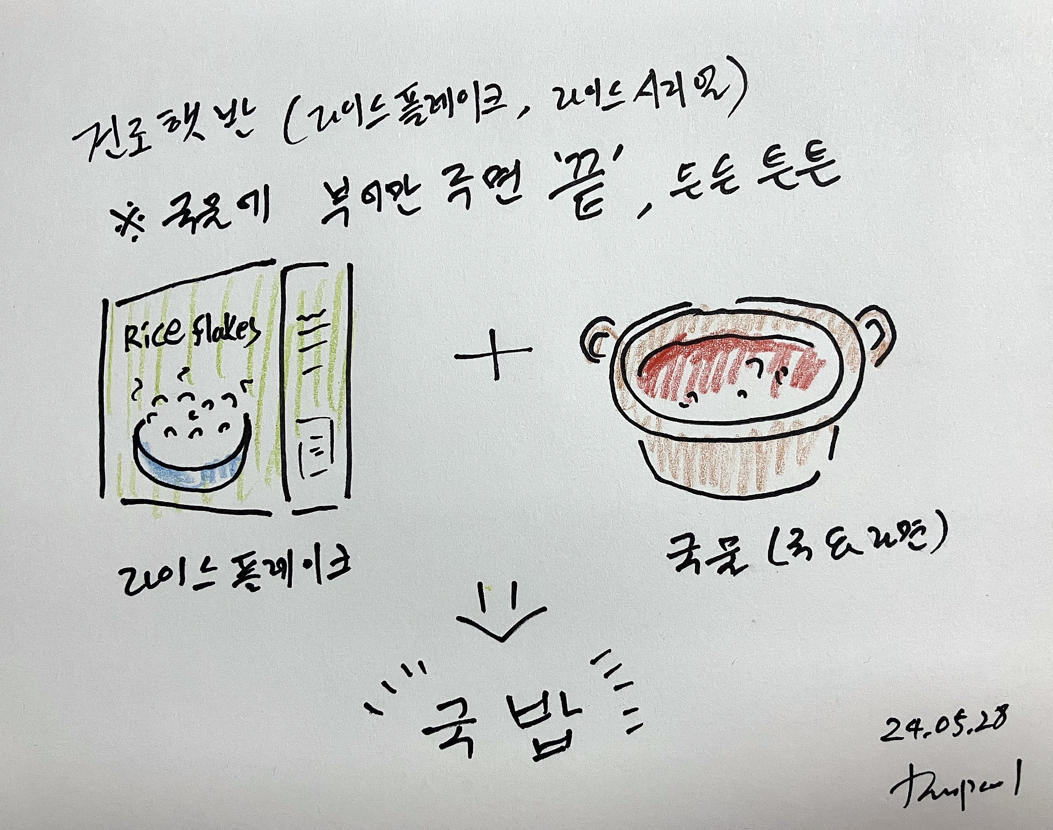 건조 햇반 (라이스 플레이크, 라이스 시리얼) 건조햇반 / 라이스 플레이크 / 라이스 시리얼 라면의 국물 등에 말아먹는 밥은 그다지 좋은 밥맛을 요구하지 않는다.국물 요리 안에 들어가면 밥의 찰기와 맛은 아무런 의미가 없다. 햅쌀이 아닌 오래된 묵은쌀이어도 괜찮다.국물에 밥을 넣어 먹는 것은, 국물이 스며든 밥의 맛과 포만감이 중요하다. 국물에 넣어 먹는 밥의 선택에 있어 찬밥을 선호하듯, 굳이 따듯하게 밥을 넣어 먹을 필요도 없다. 라이스 플레이크는 간편히 국물에 부어 먹을 수 있는 쌀로 만든 시리얼이다. (건조된 누룽지와 유사한 형태)우유에 콘플레이크를 넣어 간편히 한 끼를 먹는다면, 국물엔 라이스플레이크를 넣어 한 끼를 먹을 수 있다.햇반보다 경제적으로 생산 할 수 있고, 포장방식이 간편하며, 유통기한을 통조림 수준까지 늘릴 수 있다.대용량 봉.. memo/sketch 2024.06.20